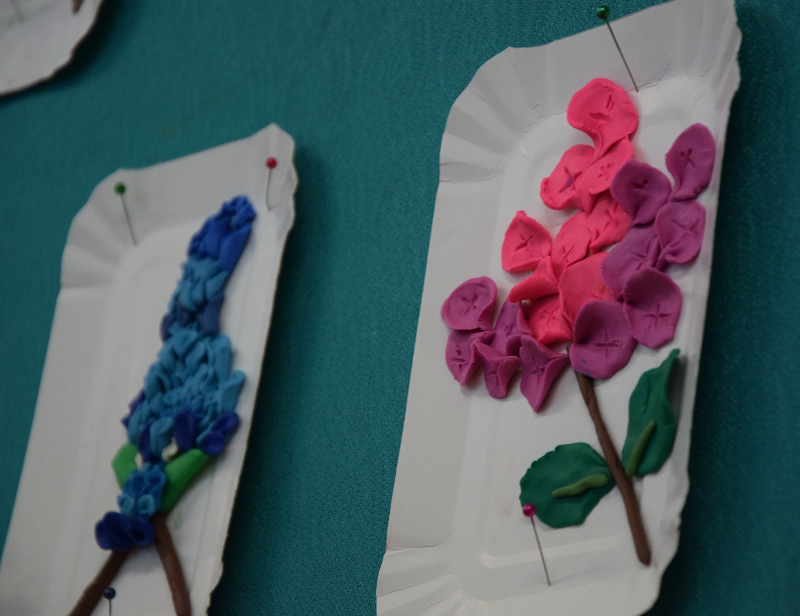 Postanowiliśmy udekorować gablotę klasową plastelinowymi gałązkami bzu.